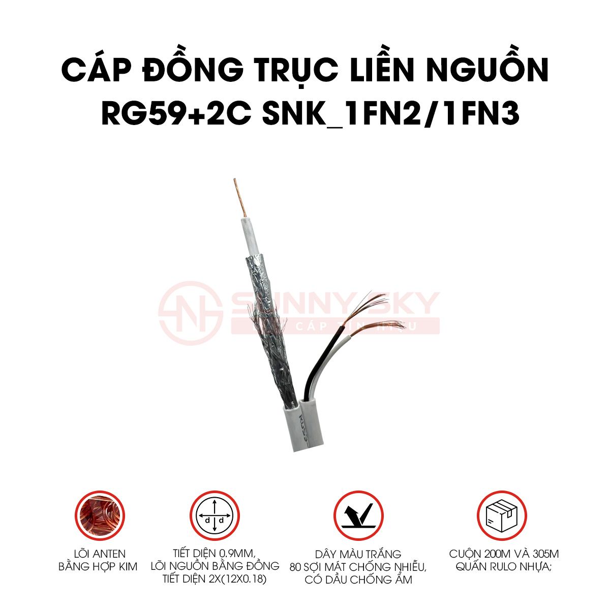 Với dây chuyền sản xuất hoàn hảo của thương hiệu Sunny Sky Cable, CÁP ĐỒNG TRỤC LIỀN NGUỒN RG59+2C (SNK_1FN2/1FN3) đảm bảo: